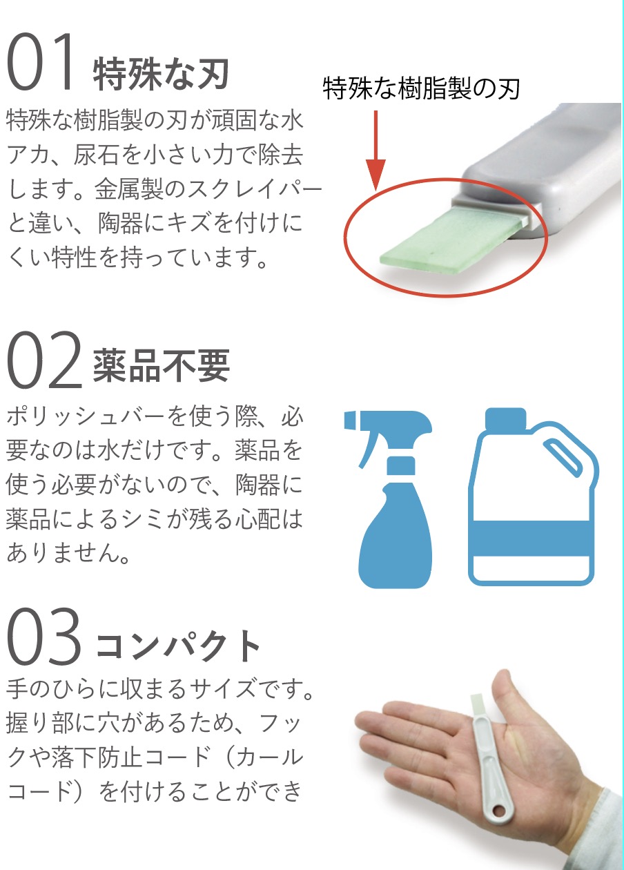 きれいにしたい部分に水をかけて特殊な樹脂製の刃でこするだけです。薬品を使用しないのでシミが残る心配はありません。