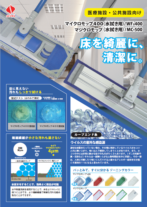 埃をからめとり舞いあげにくいマイクロファイバー製のモップ、特にフラット型のモップは広い面で掃除ができ洗濯もしやすいのでオススメです。
